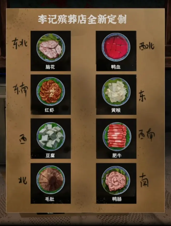 如果不知道这些是什么的话,就要看一眼桌子上的菜单了,剧情过后菜单上很贴心的给标注了位置哦,不过我们需要确定一下结合前面八卦的位置和火锅上的图案,确认火锅最上面是离,离是南所以最上面就是南,也就是以最上面开始顺时针为鸭肠-肥牛-豆腐-鸭血-牛肚-脑花-黄喉-红虾。