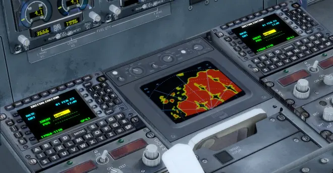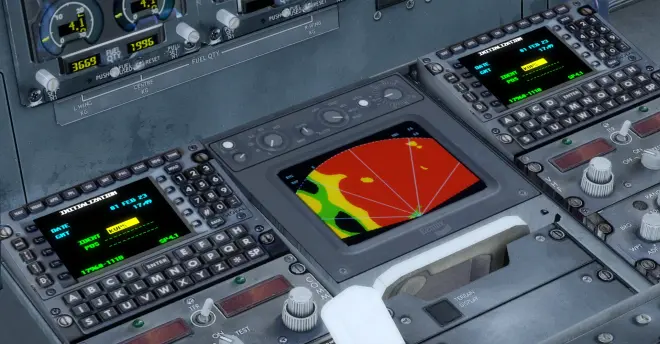 作为一款最早起源于FS9时代已经有10年多历史的机模,在十多年前那个互联网没有如此发达的时代,依据实时天气的复杂天气条件下的模拟飞行基本上是不可能的,所以早些年很多插件都没有气象雷达,但是如今在ASP3D这种天气插件的加成下,没有气象雷达在白天可能还好,晚上就太致命了,根据QW的建模中气象雷达位置贴图的模样,目测Milviz的气象雷达面板最为接近,都是班迪克斯气象雷达,所以整合了个REX/Milviz的Weather Radar进去。