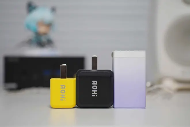 简单对比一下就可以很直观的了解到AOHI这两个充电器到底有多么小巧了,最右边这个的普通的65W GaN充电器,中间这个是AOHI 65W充电器,最左边这是则是AOHI 30W充电器,如此小巧的尺寸,旅游的时候携带非常方便。