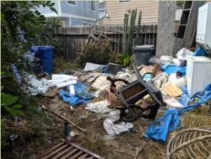 囤积财产副本的后院,棕榈泉公寓的客厅有很多垃圾,棕榈泉公寓的脏浴室水槽,