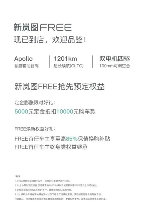 在开启新岚图FREE预定的同时,岚图也推出了抢先预定权益,包括5000元定金抵扣10000元购车款的定金膨胀限时好礼;针对FREE老车主,岚图还推出了限额100名的FREE焕新权益,包括岚图FREE首任车主享至高85%保值换购补贴,以及岚图FREE首任车主终身类权益继承,展现了岚图对于老用户的重视与关怀。