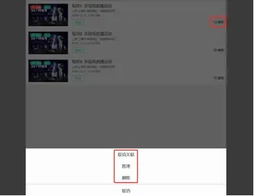 点击“管理”按钮,“取消关联”指从多现场直播活动中移除子现场,“管理”指子现场的管理界面,“删除”移除子现场的同时从主办方账号下删掉该子现场的直播活动。