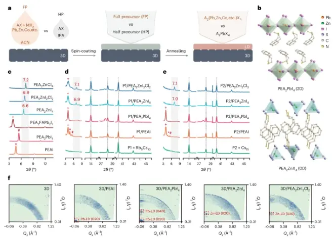 三维/低维(3D/LD)钙钛矿太阳能电池(PSC)具有较好的光伏性能和运行稳定性。叠层LD覆盖层在表面钝化、异质结结构及环境应力抵抗方面起着至关重要的作用。卤代酸盐是最常见的LD覆盖材料,通式为A2MX4(A:烷基铵阳离子,M:金属阳离子,X:卤化物阴离子),LD覆盖材料传统制造工艺是半前驱体(HP)方法,只能使用金属阳离子Pb2+/Sn2+,它们源自3D钙钛矿底层,目前Pb2+/Sn2+是无可替代的,因此,LD覆盖材料的金属阳离子仍然是一个悬而未决的问题。