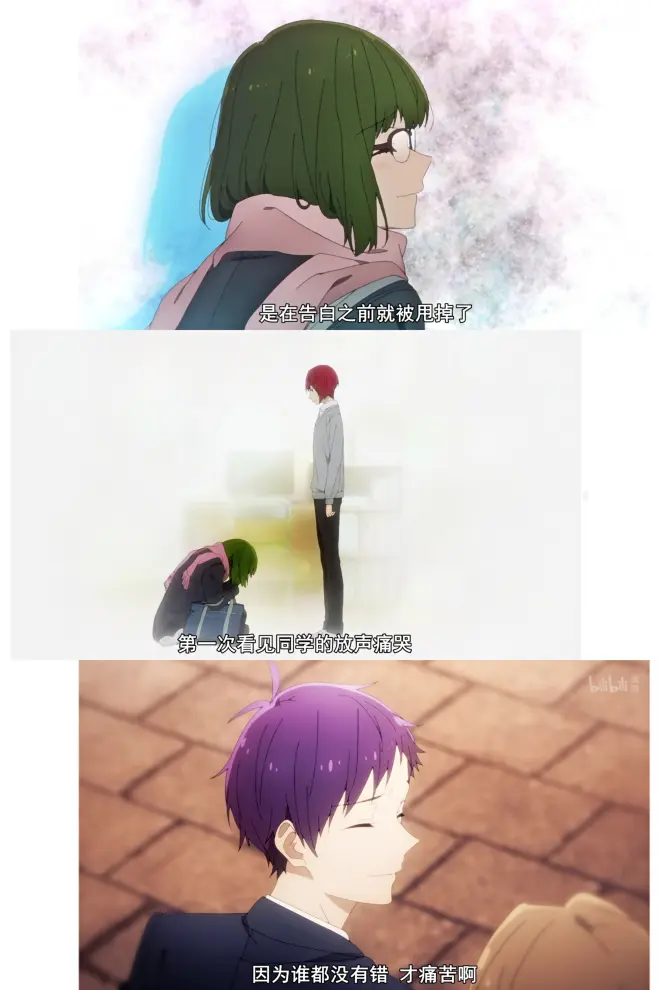 全剧登场的人物结构很简单,没有复杂的关系网,也没有任何身份的隐瞒,大约十二三个人,简简单单地出场,每个人之间的关系都很和睦,大家都如同天使一般,心中有光,温暖他人,同时也个性鲜明,有着最真实又最善良的高中生的样子,虽然我是重度颜控,但是很显然,这些人物感动到我的不仅仅是外表,更是他们无瑕的内心。正因为真实,所以才感动,正因为真实,所以也发现自己和很多角色有相似或者共鸣之处,可能在人生之中,再也找不到这样的第二部番剧了吧: