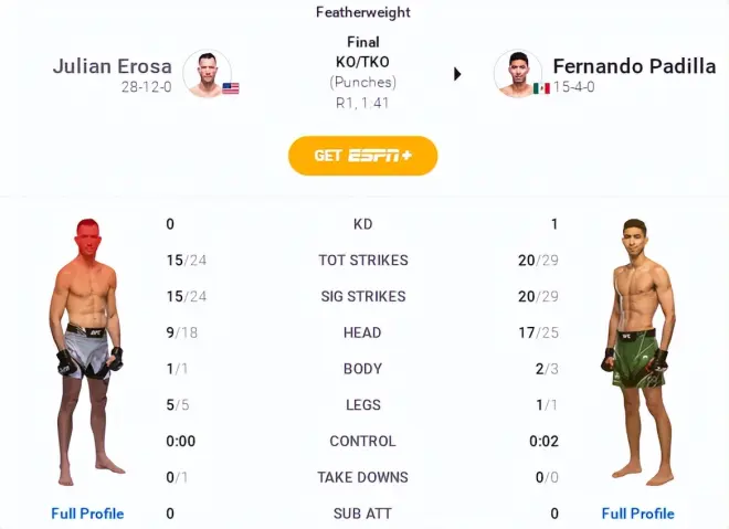 主赛第三场,墨西哥首秀新人帕迪利亚,凭借精准的拳法追击,于首回合1分41秒TKO终结胜利。比赛伊始,埃罗萨试图将节奏放缓,通过拳腿单击消耗。第1分30秒时,帕迪利亚拳法3连击连续命中,趁势追击时同样弹无虚发,将对手无情KD击倒。场裁克里斯.托尼奥尼(Chris Tognoni),眼见埃罗萨爬起后防守不见好转,选择提前叫停比赛。