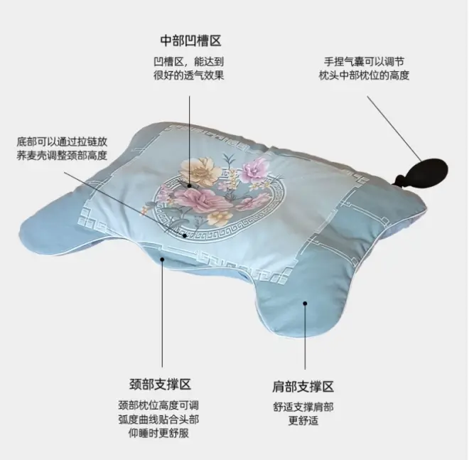 此外,荞麦壳护颈枕还具有长久的使用寿命。传统的枕头经过一段时间的使用后,会变形、松软或者失去支撑力,导致睡眠质量下降。而荞麦壳护颈枕是枕芯分仓设计,并带有胶皮气囊,调节颈部和头部枕位的高度,无缝贴合您的头部和颈部,使用寿命也会比传统枕头更长。