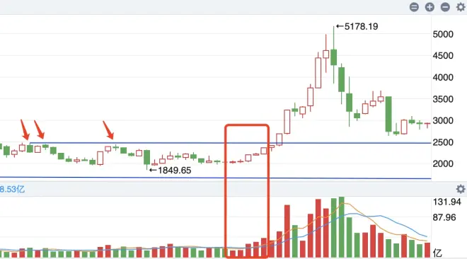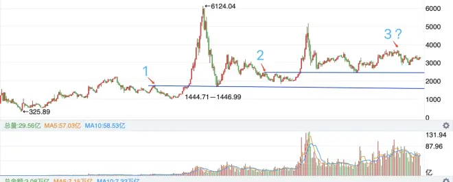 参照前两波牛市,牛市的特点,大概率是前期的洗盘下跌高点开始下跌,长时间的换手洗盘,然后在质疑声中开始缓慢的量能略微放大的上涨。