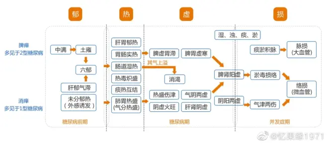 中医认为,糖尿病是因为身体里的气血不平衡,有四个阶段,分别是郁、热、虚、损。