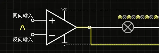 发明运算放大器的人绝对是天才。中间两端接上电源,当同相输入大于反相输入,右侧就会输出(接近)电源电压(Vcc),如果反过来小于同相输入,则输出0V(负电源)电压。