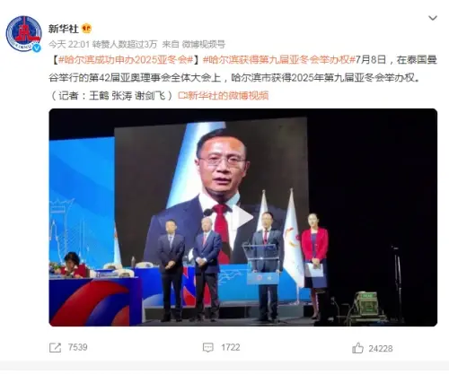 7月8日,在泰国曼谷举行的第42届亚奥理事会全体大会上,哈尔滨市获得2025年第九届亚冬会举办权。