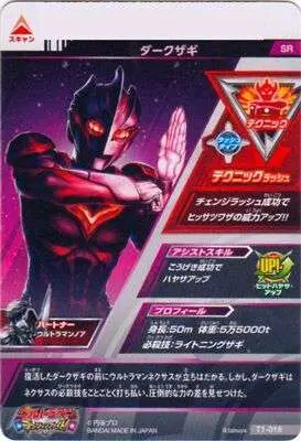 食玩卡资料 邪恶的黑暗破坏神 黑暗扎基 必杀技:闪电扎基 与诺亚奥特曼是对立的存在的邪恶的战士。具有用邪恶的光征服异生兽,将人类心中的黑暗增幅,变为黑暗的巨人的恐怖能力。
