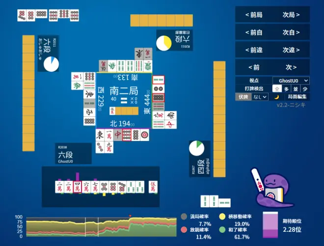 打7s固定双dora的强型对本局和出价值起了保障作用,也丢失了摸5p和6s的不错进张。而打3p恰好相反,优缺点差距感觉并非特别明显。有不少高段朋友打7s固定打点进张,也侧面反映了双dora在两个小题中的价值。