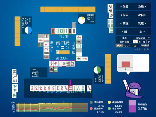 立直能够任意和完场,然而,上家9m的位置和对家染手意味着m侧的58m可能是较愚形的听牌。最重要的是,立直带来的任意和逆转无法弥补放铳上家和对家追立带来的可能四位率。dama由于高目仍然可以完场,自摸或者直击同理,也算是有了一些慰藉。