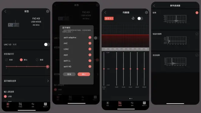 K9有一定智能化属性,支持App控制,除了开关机,EQ、滤波、声道平衡等,音量旋钮的灯光也可以通过App控制,主要用来指示当前的操作状态、码率信息。还支持固件升级。