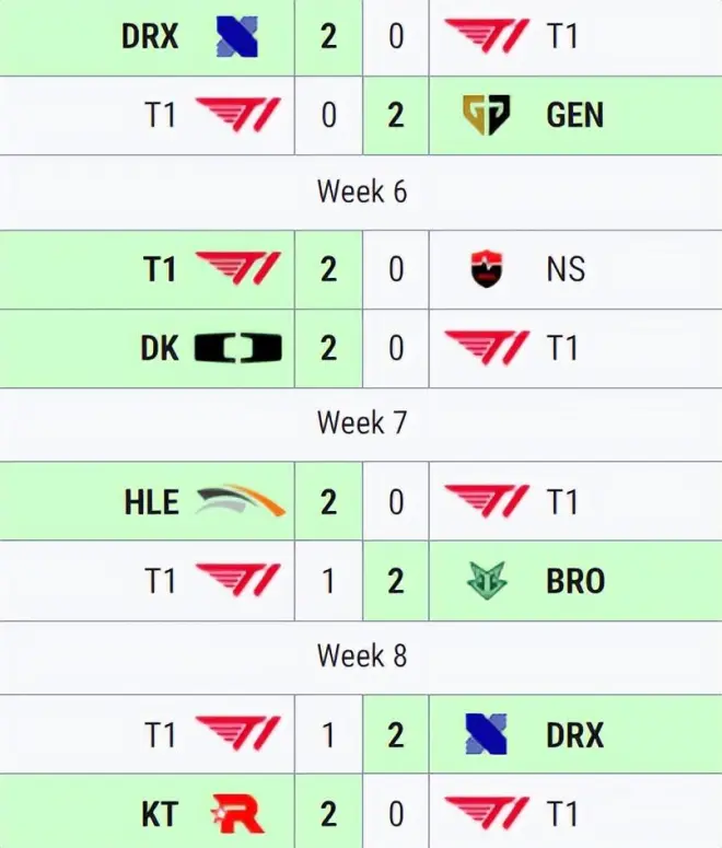 整整四周的常规赛,8场BO3,而他们只赢了一局,且在所有输掉的系列赛中,他们只赢了两个小场,这就是说,在这八场 BO3里,T1的小场战绩是4-14,这个成绩可以说是相当烂了。