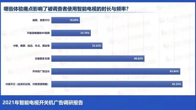 而在另一项调查中我们发现,用户对于体验痛点和使用时长,频率等问题也存在一些对开关机广告的不满。