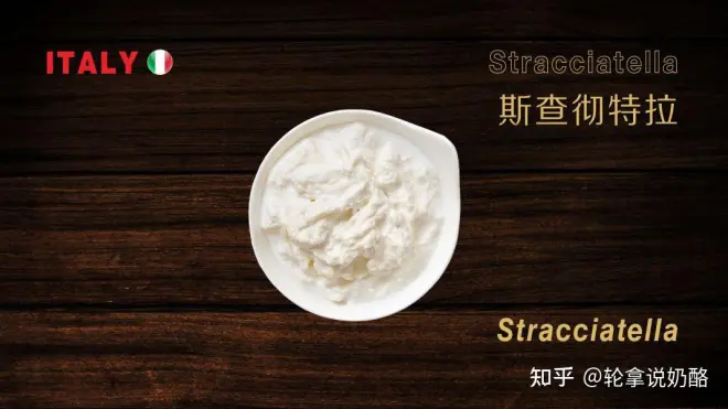 Stracciatella 奶酪,也可译为“丝绸奶酪”或“斯查彻特拉奶酪”,从水牛奶中制作而成。它比马苏里拉奶酪更柔软、更液体,因为它富含奶油。出于这个原因,这款奶酪味道也更甜,具有更强烈的牛奶风味。
