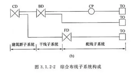 2 综合布线各子系统中,建筑物内楼层配线设备(FD)之间、不同建筑物的建筑物配线设备(BD)之间可建立直达路由【图3.1.2-2(a)】。工作区信息插座(TO)可不经过楼层配线设备(FD)直接连接至建筑物配线系统(BD),楼层配线设备(FD)也可不经过建筑物配线系统(BD)直接与建筑群配线设备(CD)互连【图3.1.2-2(b)】