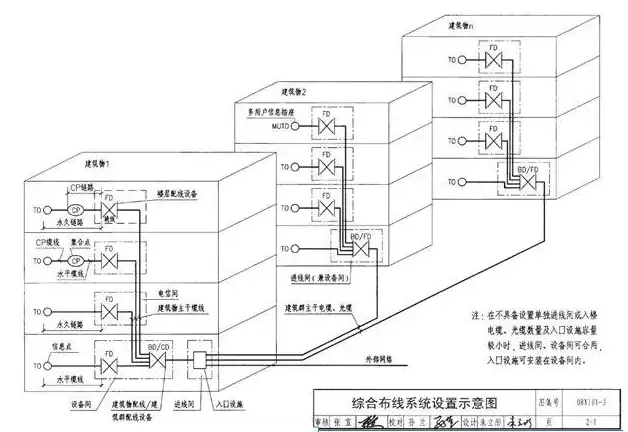 3 综合布线系统入口设施连接外部网络和其他建筑物的引入缆线,应通过缆线和BD或CD进行互连【图3.1.2-3】。对设置了设备间的建筑物,设备间所在楼层配线设备(FD)可以和设备间中的建筑物配线设备或建筑群配线设备(BD/CD)及入口设施安装在同一场所。