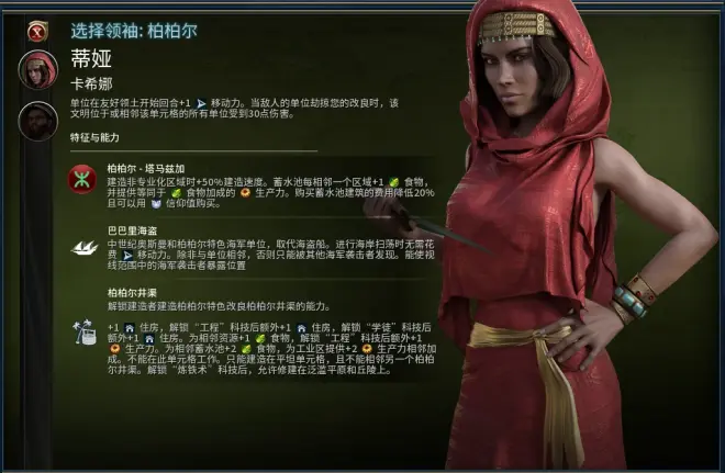 蒂娅:LA为卡希娜:单位在友好领土开始回合+1移动力。当敌人的单位劫掠您的改良时,该文明位于或相邻该单元格的所有单位受到30点伤害。