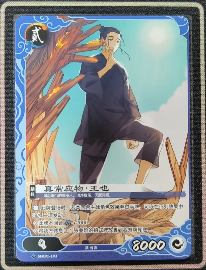 卡牌说明:蓝色阵营贰阶卡牌。效果为登场我方主战弃过手牌,可以选择炁+2000或者将我方休息区一张叁阶招式牌放回牌库底。是一张需要配合且视情况使用的贰阶牌。