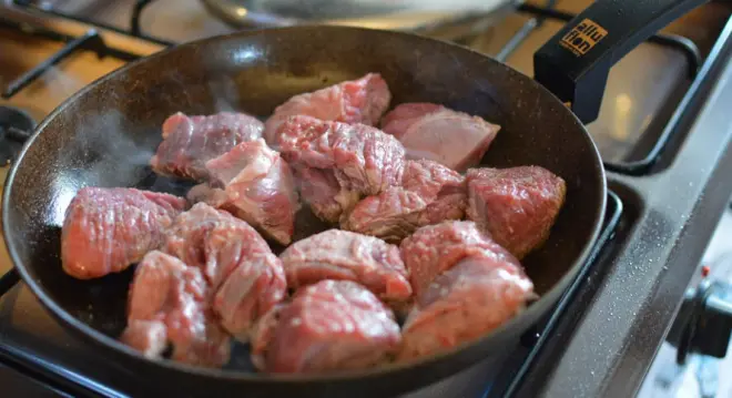热锅冷油炒牛肉:先将锅加热,加入少量的油,待油热后加入腌好的牛肉片,快速翻炒几下后捞出备用。