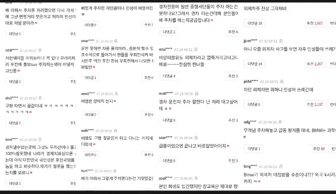 韩网友们纷纷留言“拉完了回来重新停车”、“进口车车主最近频频上热搜啊”、“那个轻车车主技术不错啊,我都不会啊”、“开个旧款破车脾气还那么暴躁”、“轻车停车位总有这种垃圾人,我也在想办法搞他们”、“有没有什么办法整这些占轻车停车位的”、“这回上新闻了,这车该报废了”、“这回全国丢人了”、“现在还有拿进口车当身份的傻子吗”、“什么损毁名誉,狗有什么名誉”、“比现代还便宜的进口车”等表示无语。