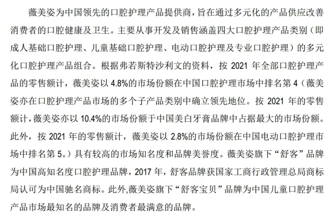 不过,有趣的一幕是,公告显示,根据弗若斯特沙利文的资料,按2021年全部口腔护理产品的零售额计,薇美姿以4.8%的市场份额在中国口腔护理市场中排名第4。