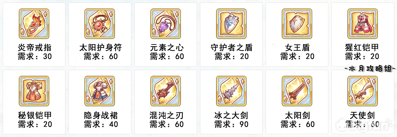 混沌之刃、元素之心、太阳剑、天使剑分别都需要60个碎片