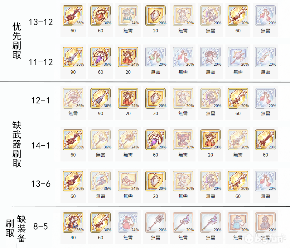主要优先刷取13-12和11-12,存够数量后再补齐其余装备。