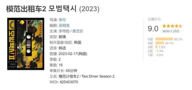 《模范出租车2》第二季首播收视率破10%,算是中规中矩,剧情依旧算大尺度,豆瓣评分也很给力。开分就给了9.0的高分!