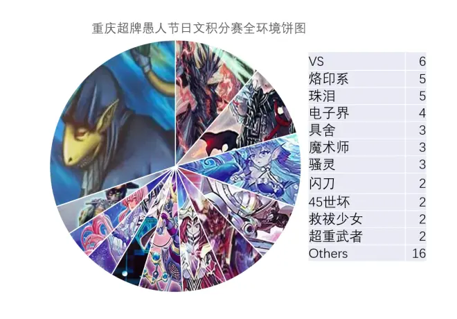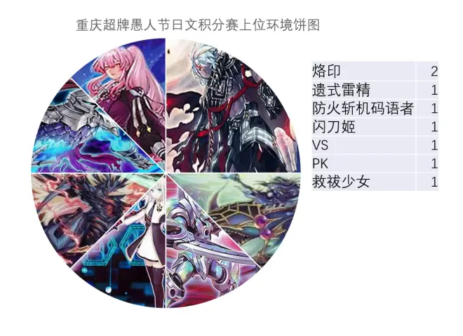 除烙印外,其他上位卡组都是些环境不太常见的,遗式雷精在14师傅对炮龙的再开发下取得了瑞士轮全胜的好成绩,可惜淘汰赛被胡死了。。。电子界也就是防火斩机码语者是重庆特产上位卡组,上位洒洒水啦。VS是这次使用率最高的卡组,但明显还没适应重庆环境,还需要调整。PK在珠泪、地天使、深渊系均被限制的四月里,属于是解除了封印,期待以后会有更好的表现吧