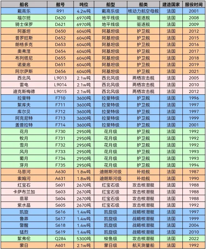 法国海军现在只有2驱18护,其中6艘还是花月级这种根本不装备导弹的巡逻护卫舰,另外还有5艘是拉法叶(这个翻译更贴合法语发音)/拉斐特级这种武备极弱的二等护卫舰。