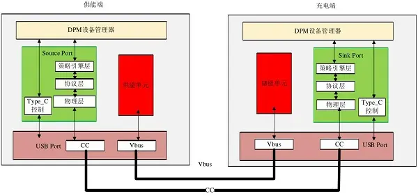 PD3.0快充协议完整的结构是由Source端和Sink端组成。PD3.0协议系统结构如下图所示,其中在功能结构上Source端和Sink端有着相似的结构,用来满足在工作中通过快充协议协商并交换供电角色。