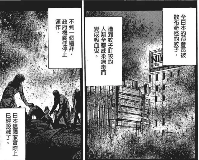 大约是半年前 全日本被一种蚊子袭击 被咬的人开始攻击同类 全日本也停止了运行 帽子哥见黑衣男在抽烟也要了颗