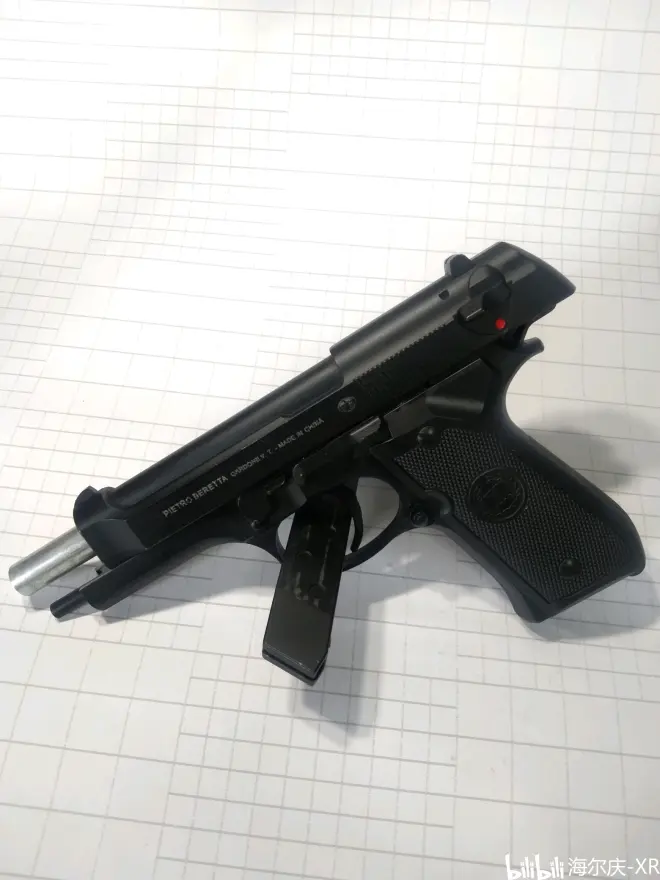 因為是兩片殼,所以無法避免合模線,毛邊處理得很干淨,滑套上保險的紅色印紋只做了一邊,另一邊是自己涂的,沒有做出擊針的樣式,准星和照門也沒有涂裝