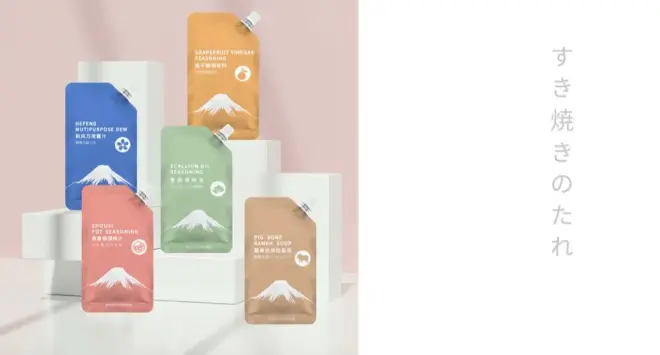 识别成本:文字识别> 图形识别>色彩识别羚佳设计从颜色出发对产品口味进行市场调研,将产品口味抽象为对应的色彩,如麻辣拉面汤使用红色,甜口的寿喜锅调味汁使用粉色,柚子醋调味料使用橙黄色,葱蒜调味用使用青绿色等。不同的色彩让不同口味的系列产品之间产生明显的区分,不至于混淆。同时包装上使用代表口味的icon图标,将其与色彩结合,在保有日式风格简约的基础上使产品口味更清晰,令消费者对产品口味信息一目了然。