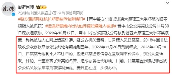 12月1日,警方就网红校长郑强包养情妇一事做出回应,这件事原来是一场有预谋的造谣诽谤,造谣者还是一个曾坐过5年牢的惯犯。
