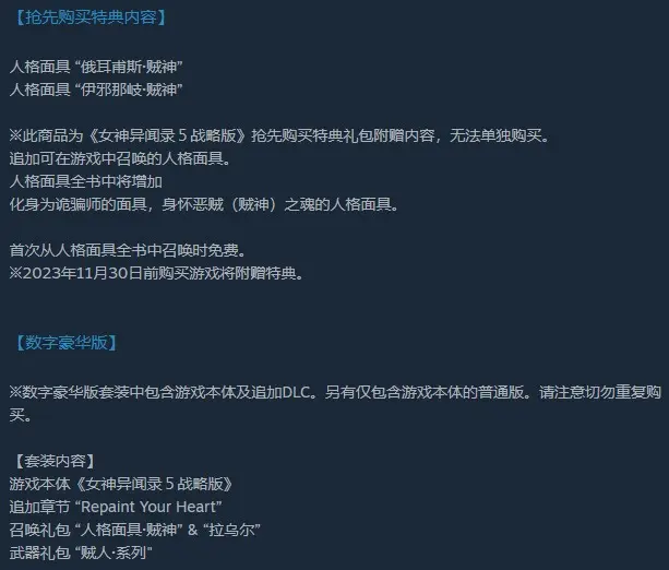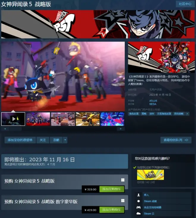 《女神异闻录5:战略版》Steam页面现已上线,JRPG同系新作来袭。今日,《女神异闻录5:战略版》Steam商店页面正式开启,游戏将于今年11月16日上线,支持简体中文,采用D加密技术。国区标准版售价319元,豪华版售价419元