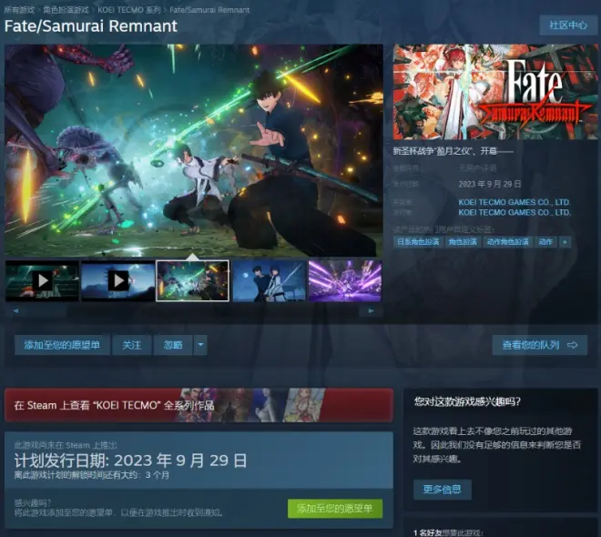 《Fate》全新ARPG9月28日发售,首部宣传片公布。今日光荣特库摩宣布,现正开发中的新作《Fate/Samurai Remnant》将于今年9月28日正式发售,游戏将登陆PS5、PS4、Switch和PC平台,实体版目前也已正式开放预购,其中Steam版将晚一天登陆,语言支持简繁体中文,并公布了PC端配置要求