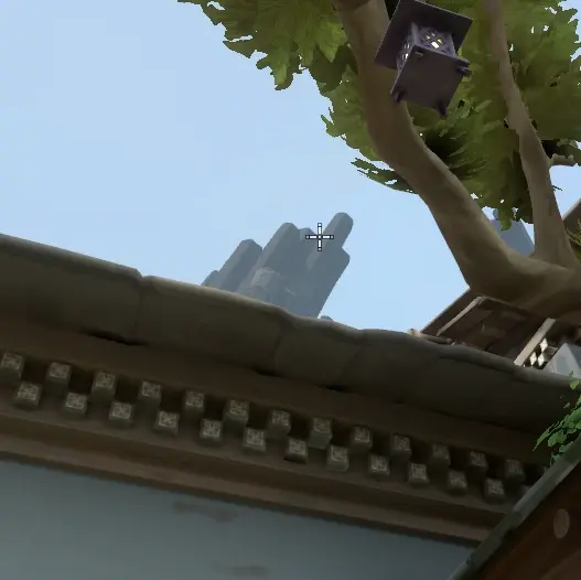 然后向前走将屋檐和墙体木条大概相交(无所谓 屋檐与木条和电线之间任意相交都行) 接着瞄准电线转折处边缘