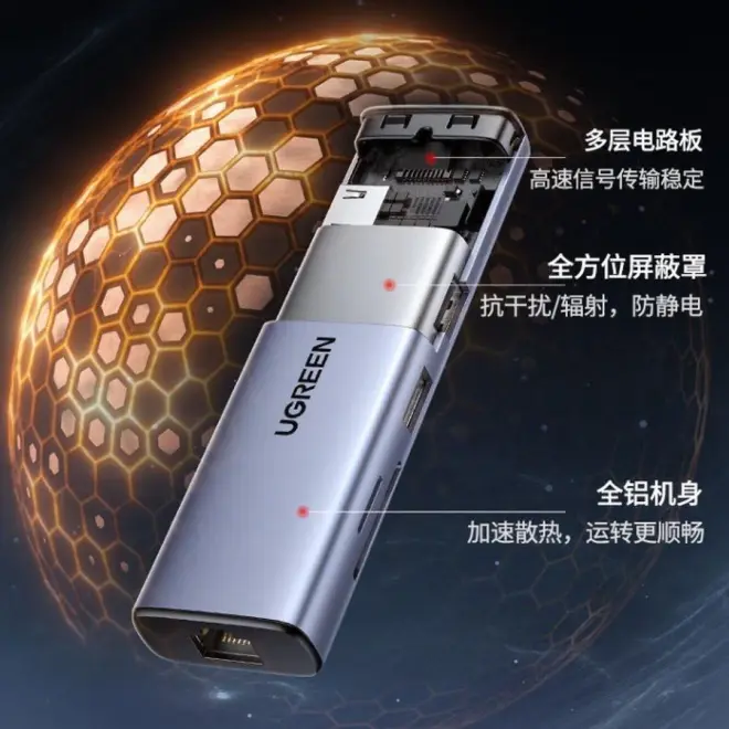 值得一提的是绿联5合1Type-C扩展坞采用铝合金机身,内部PCB板的外部加入了屏蔽罩,能够有效消除外部信号的干扰,避免连接蓝牙外设(键盘、鼠标)的时候出现同频2.4G,导致断连、卡顿的情况。