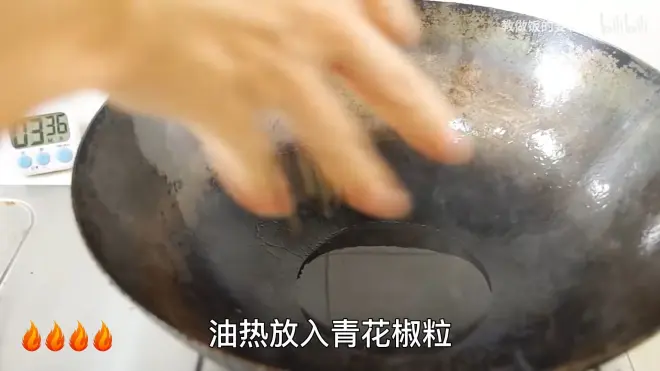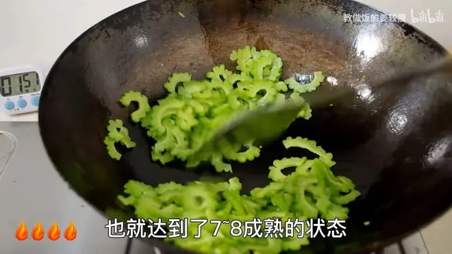 先判断配菜容不容易熟,苦瓜比较厚,先炒至七八成熟。炒的时候倒一小口水,防止苦瓜干瘪不美观。苦瓜基本变软,达到7 8分熟盛出备用