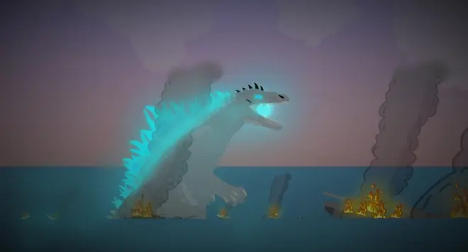 所有舰艇炮台对准了她,发射!导弹如雨一般向着怪物飞去,导弹似乎对她完全不起作用,当爆炸云消失后,她居然没任何伤口,反而还激怒了她,她发一声如同雷呜的怒吼后,又潜入了水面,以背鳍为刀,向着攻击舰游去,导弹继续向着她打去,但还是完全不起作用,那俩艘攻击舰被她如同刀刃一般的背鳍撞爆,所有飞行员架驶战斗机起飞,向着那怪物冲去,从空中看那怪物,背上有着28块类似于火焰一般背鳍,尾部还有一个类似于鲨鱼背鳍的尾鳍,体长和航母相当.