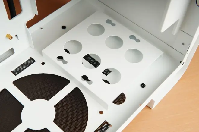 机箱顶部则有大面积的通风孔设计,顶部标配有一块磁吸防尘网,并且这块磁吸防尘网的小提手做得相当的有逼格,机箱顶部的风扇支架最大支持240一体式水冷的安装。