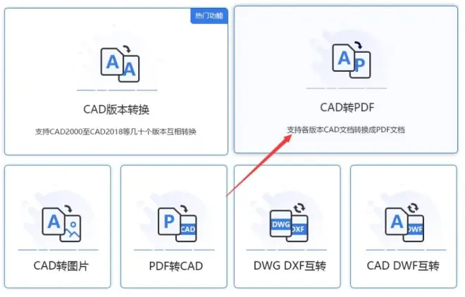步骤1、下载安装并打开第三方在线转换器的软件,在安装完成之后,找到并点击“CAD转PDF”;