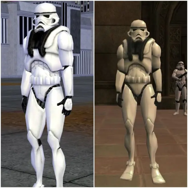而同时,银河帝国也将针对于绝地武士而开发的“清洗士兵机器人”作为原型而改造成“第一代黑暗士兵“,而第一代黑暗士兵由于是机器人,但与前身型号的清洗士兵机器人来说,拥有了更强的克制原力敏感者的战斗力,近战方面也碾压大部分的凡人和其它有机生命体,其核心编程中也包含有类似BX特种突击机器人的格斗技巧,能够灵活使用近战武器与原力敏感者进行战斗,而特殊的机械构造能够抵挡住“原力推”。