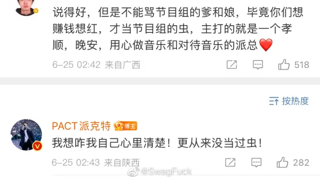 而且,派克特这里还对粉丝爆料说,节目组赛制规定了表演中说一次脏话扣5票,并点名了法老/小精灵/早安《健将PLUS》里有脏话(未播出),但是最后投票结果并没有扣《健将PLUS》的票。