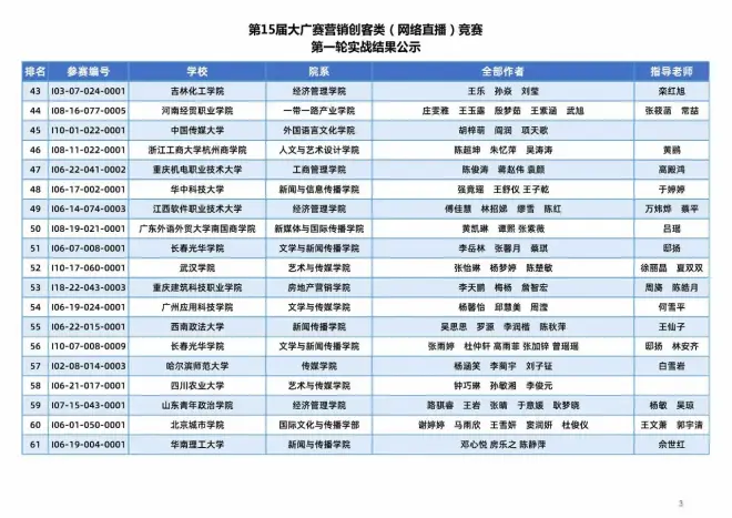 第15届全国大学生广告艺术大赛营销创客类(网络直播)竞赛第一轮实战决赛已经结束,95组正式参与网络直播团队,经过5天直播实战,通过综合考核,现共61组团队晋级下一轮竞赛。
