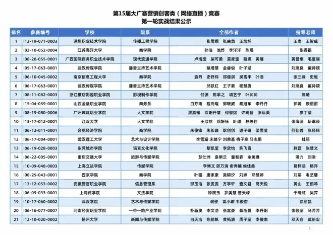 第15届大广赛营销创客类(网络直播)竞赛 第一轮实战结果公示